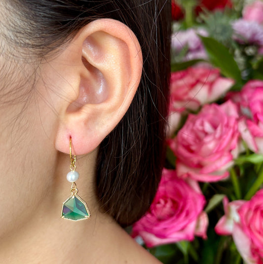 14ct Gold Plated Fresh Water Pearl Green Faceted Glass Drop Earrings