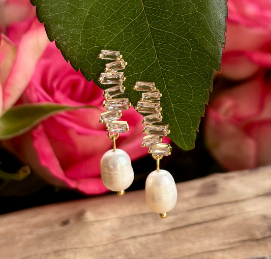 14ct Gold Plated Cubic Zirconia Zig-Zag Fresh Water Pearl Earrings