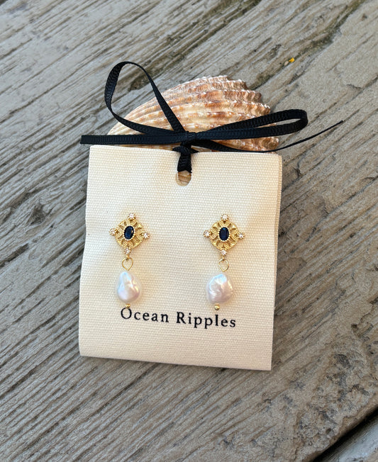 14ct Gold Plated Fresh Water Pearl Blue Filigree Earrings