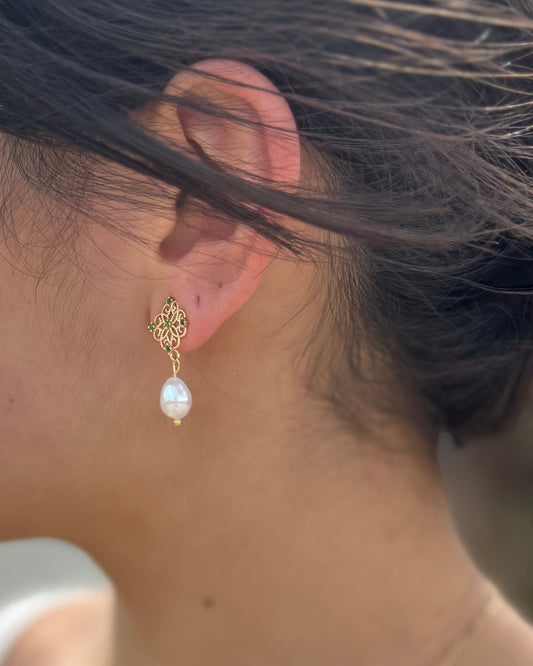 14ct Gold Plated Fresh Water Pearl Green Filigree Earrings