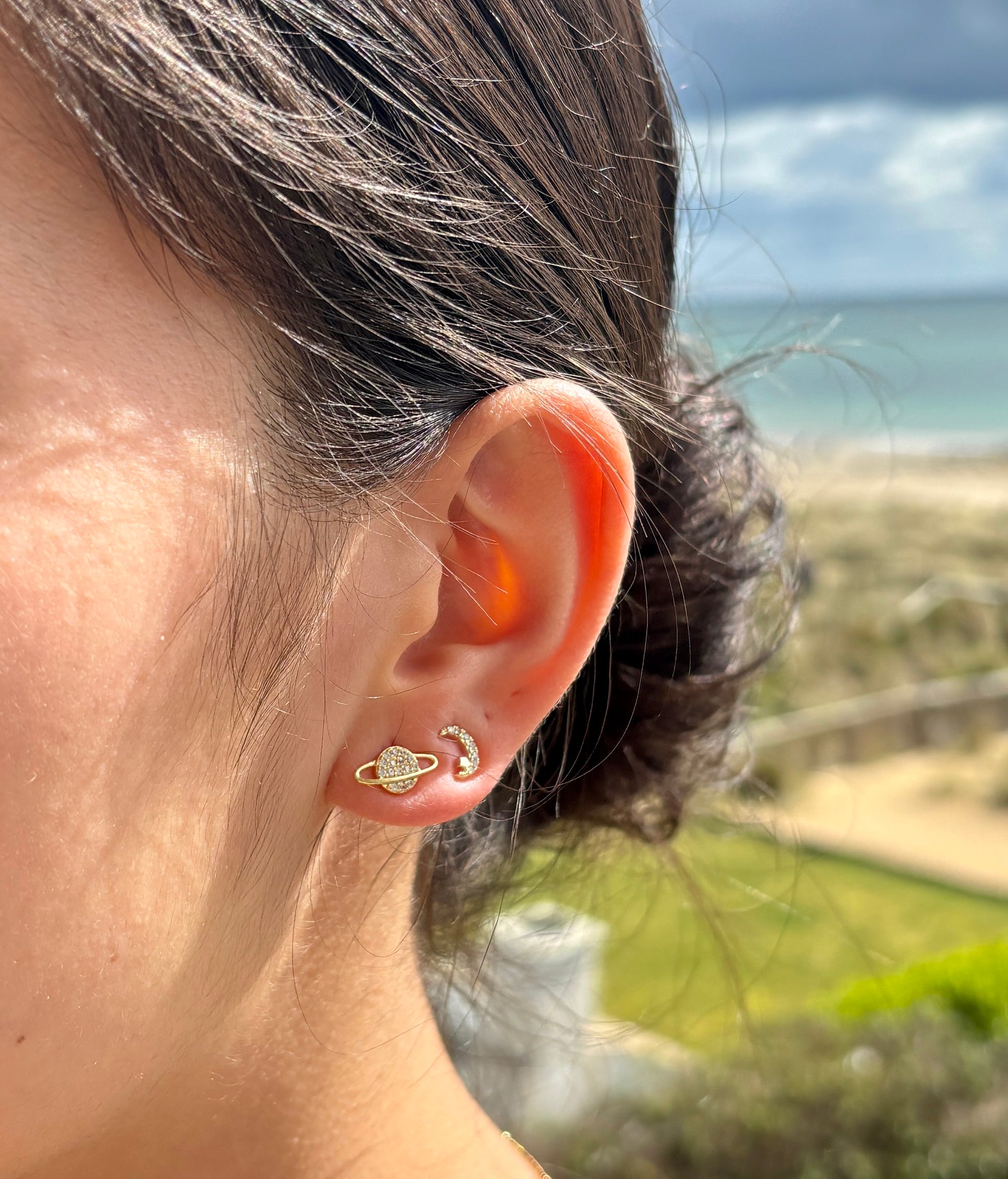 These 14ct gold-plated earrings feature a unique mismatched design,with one earring showcasing a crescent moon and the other a planet. Both are encrusted with delicate cubic zirconia, adding a touch of sparkle and charm.