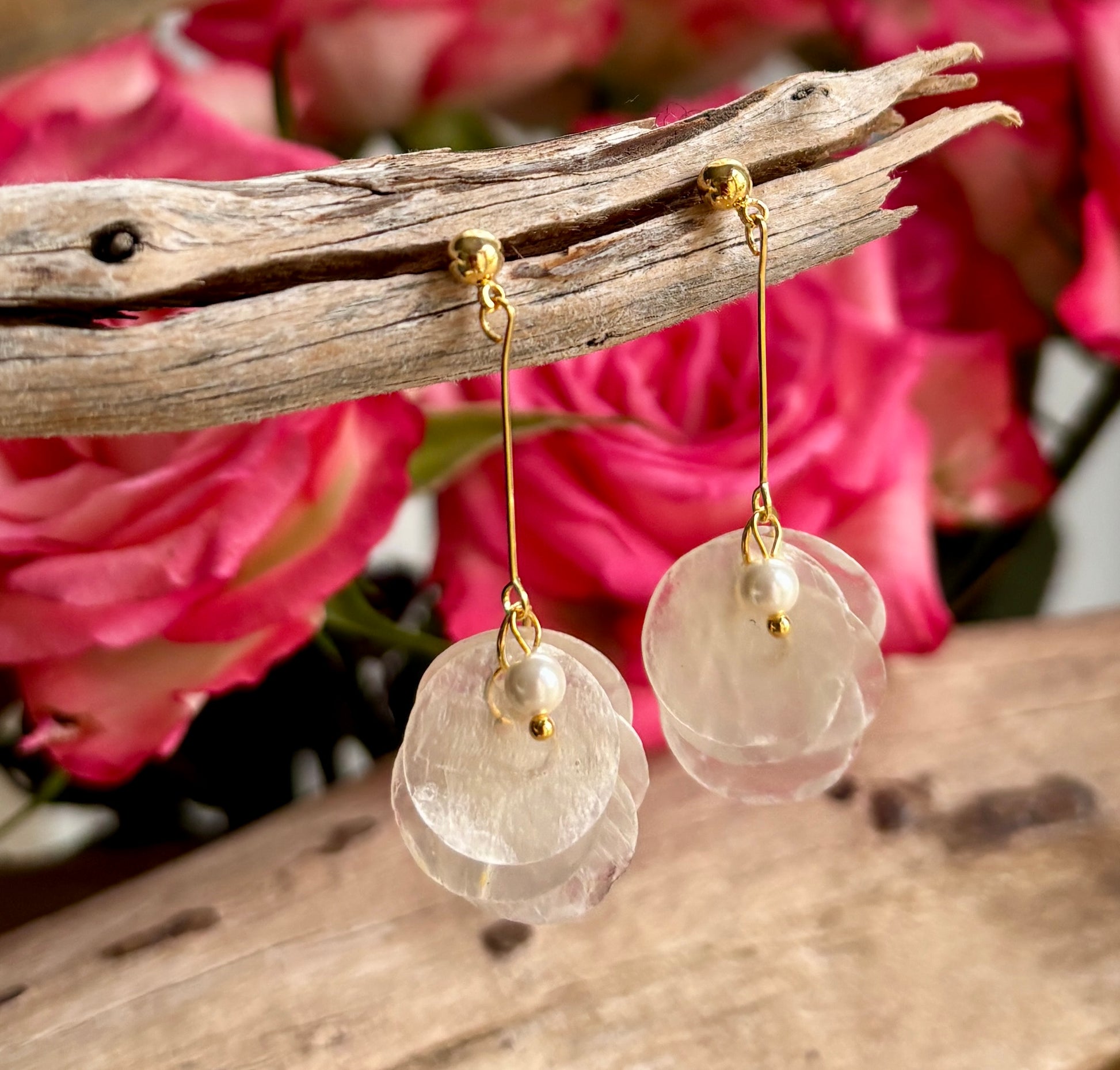 These elegant 14ct gold plated earrings are a truly refined piece, designed to gracefully fall from the ear on a delicate gold stem. At the base, they burst like a flower with layer upon layer of cream mother of pearl wafer-like discs, complemented by a dangling seed pearl for an added touch of sophistication.