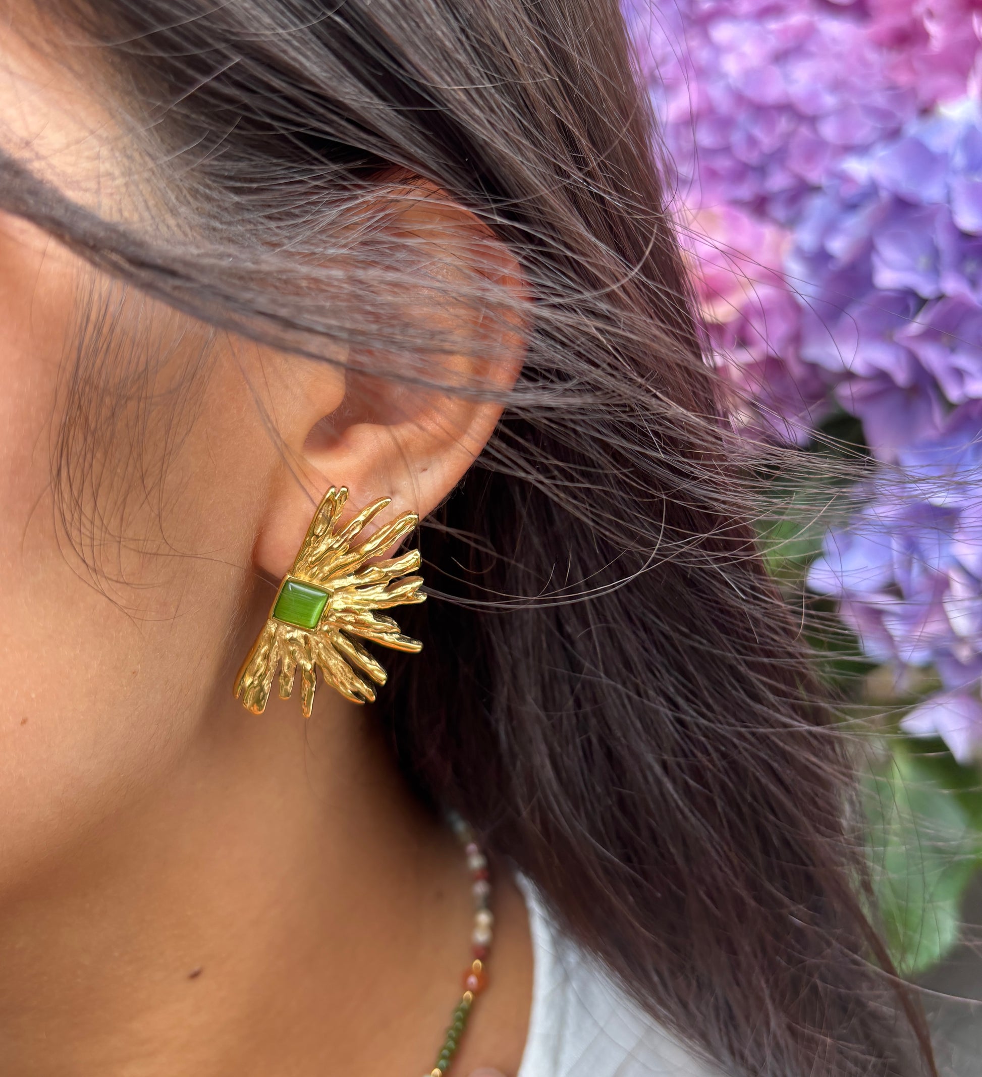 These beautiful 18ct gold plated earrings fan out from a central square agate stone, forming a striking design that elegantly curves around the ear.