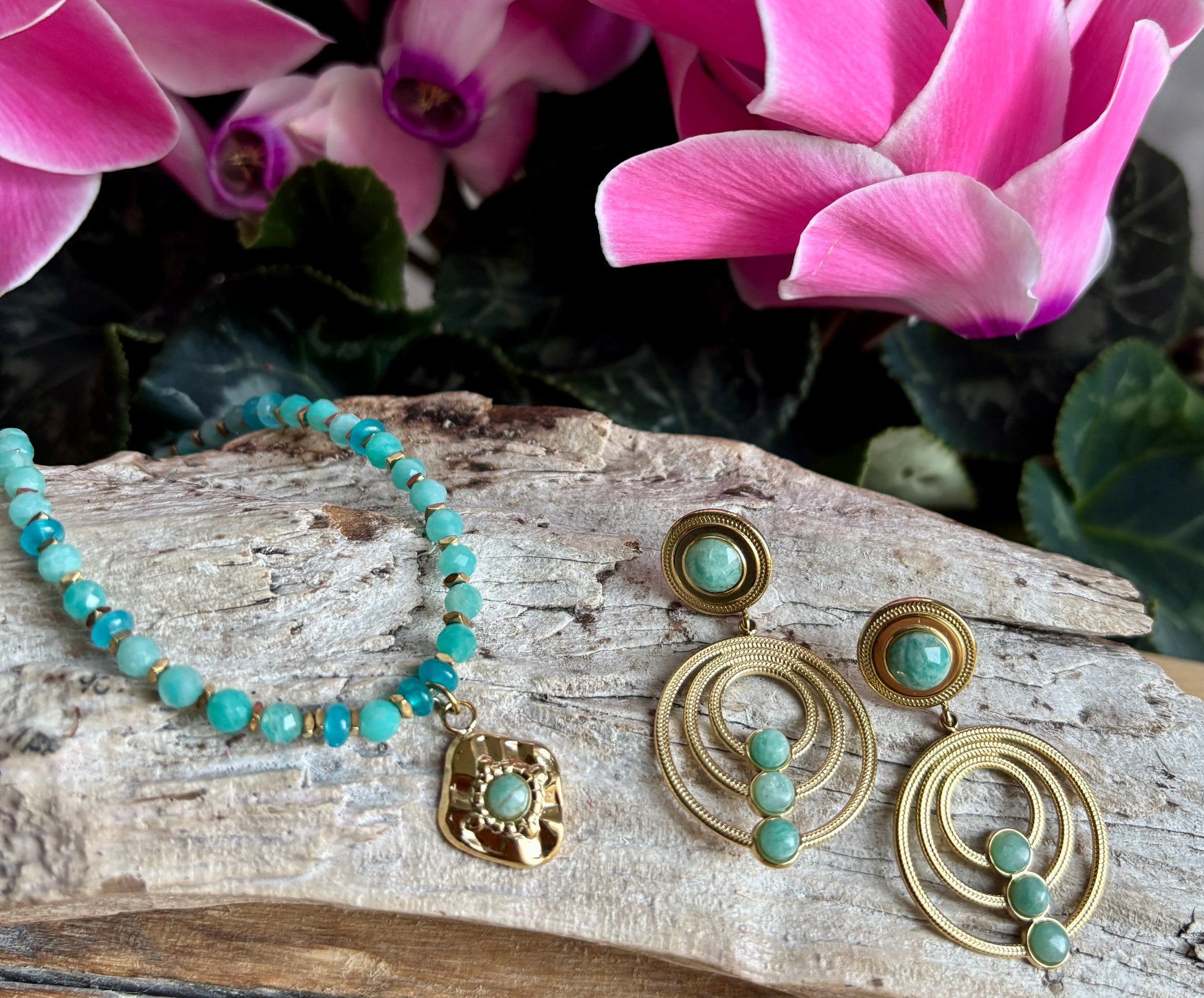 A vibrant strand of Amazonite beads holds a gold pendant accented with a small Amazonite stone at its centre, blending oceanic blues with elegant gold for a fresh, bohemian look.