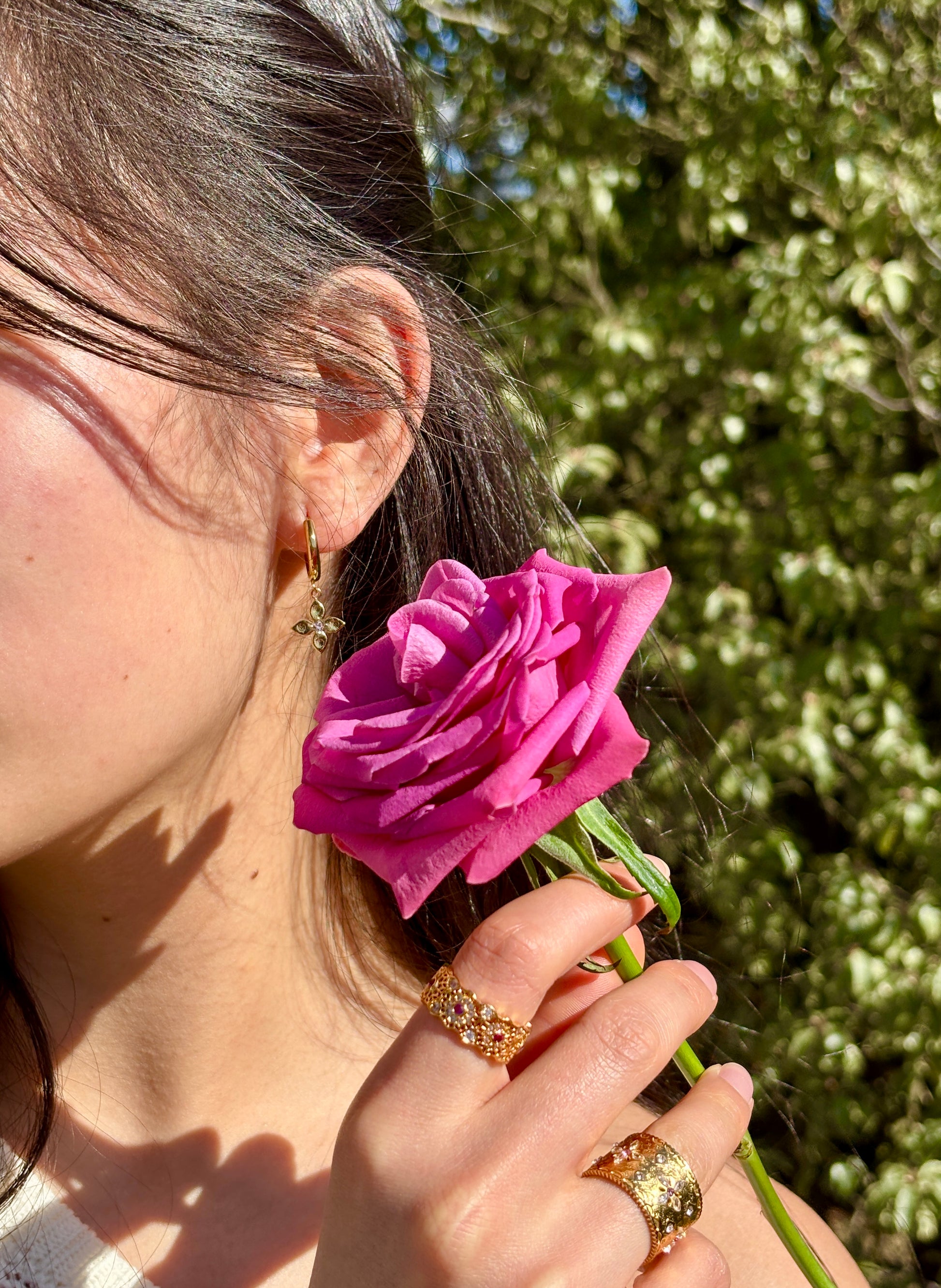 With a cubic zirconia stone set in each leaf and a simple indentation for added texture, every detail has been carefully crafted.