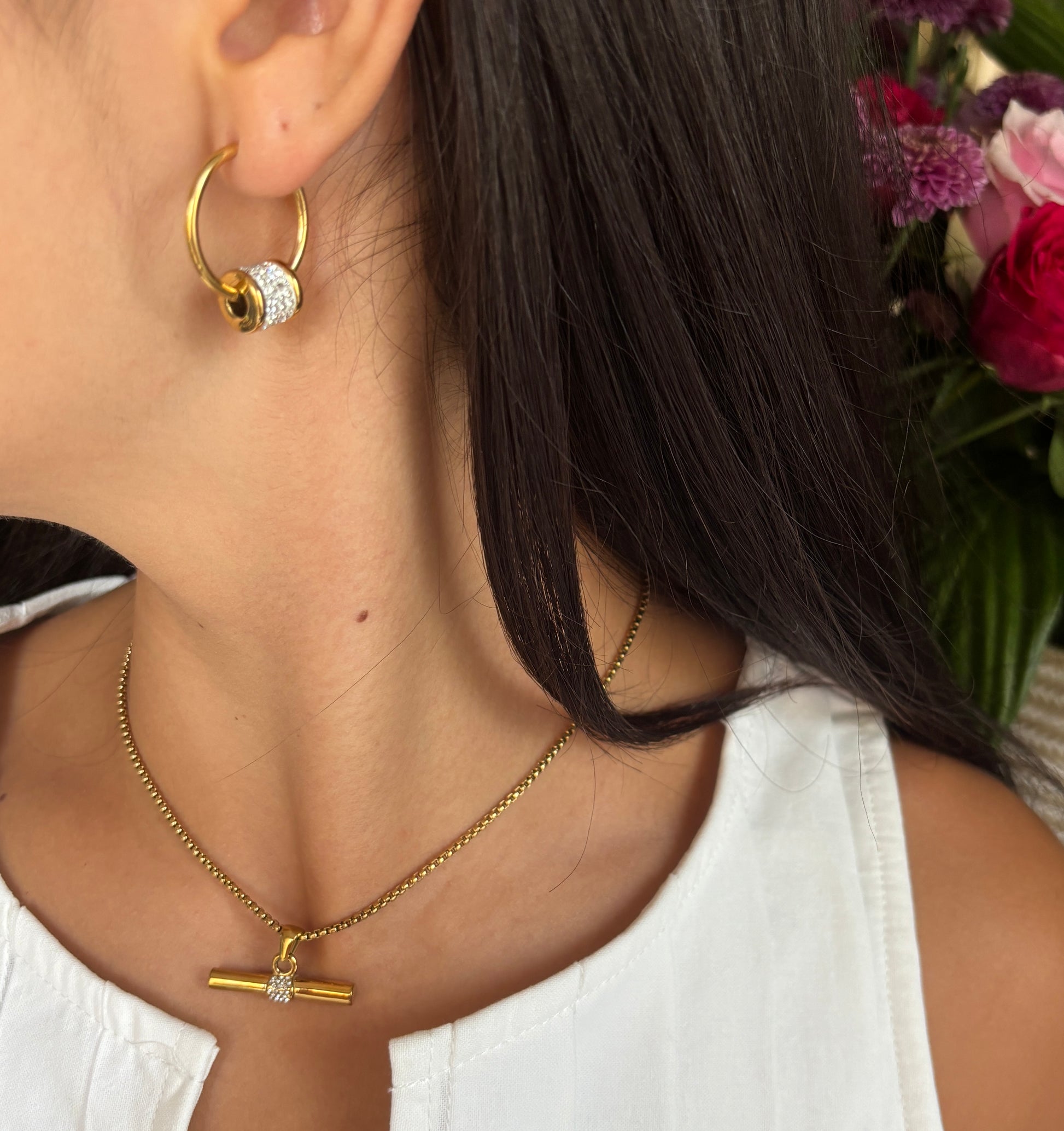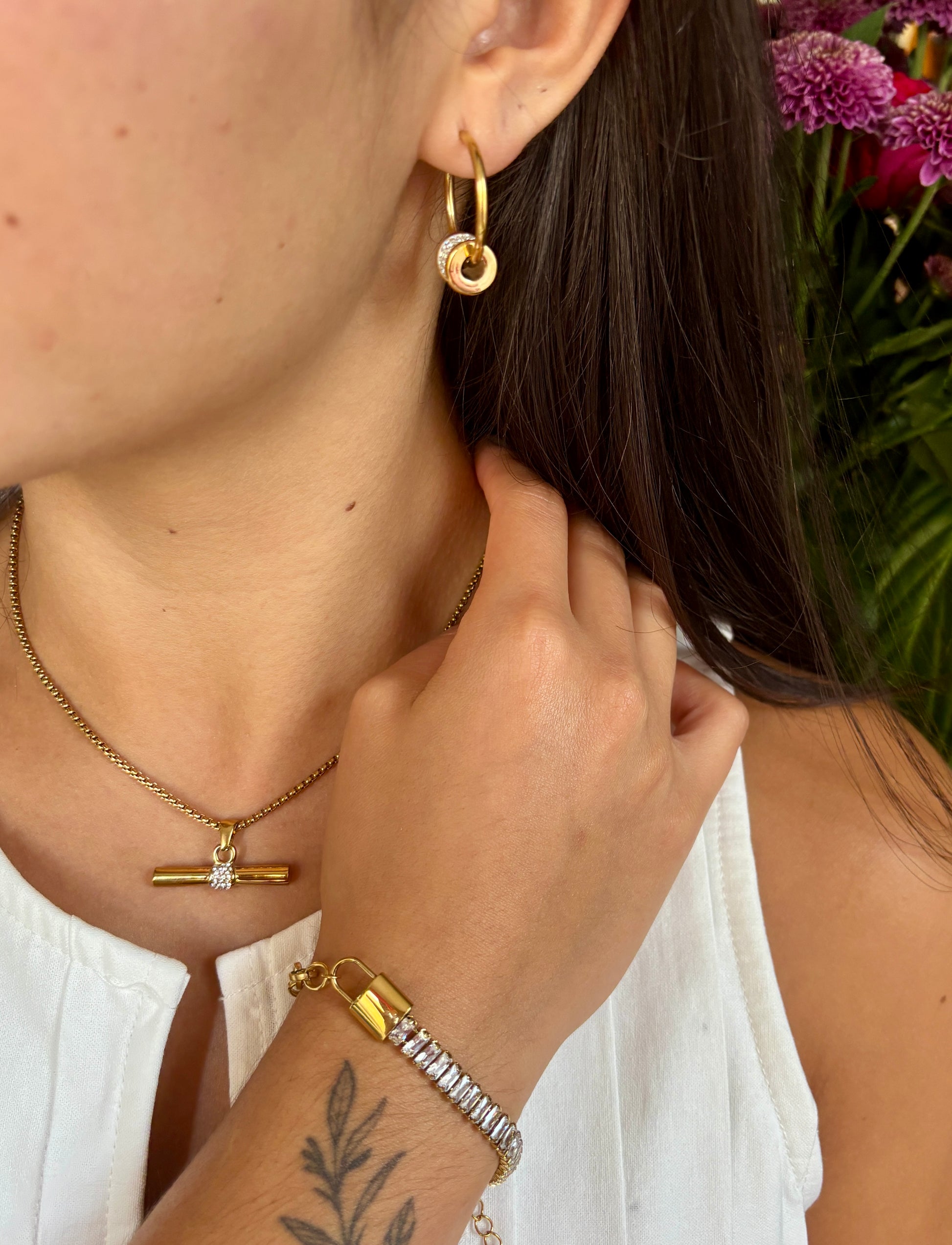 A sparkling 18ct gold plated hoop earring for this season featuring a show-stopping cubic zirconia baton edged in gold.