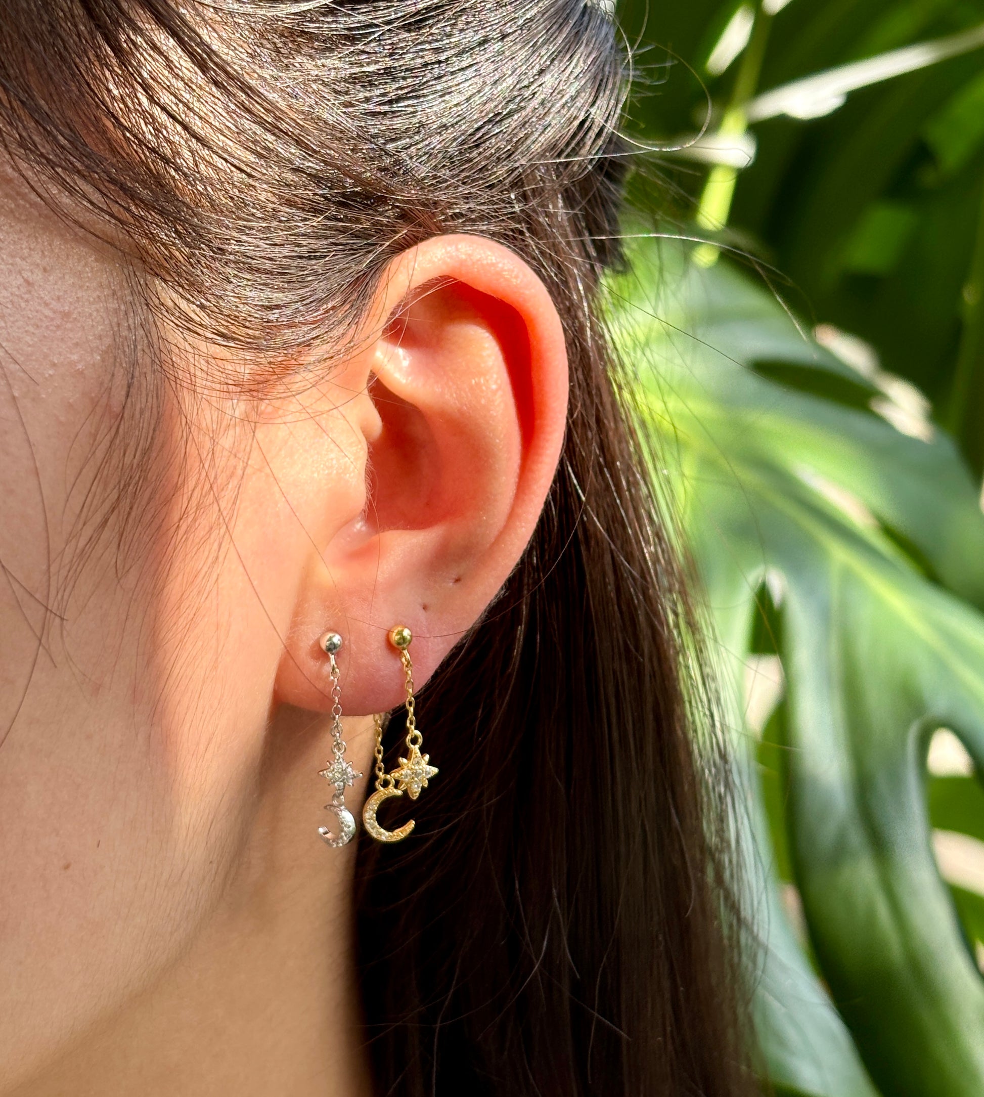 Shine bright in these adorable star and moon earrings which hang elegantly from a fine chain. The moon delicately drops from the back of the ear while the star sits at the front of the lobe, creating the illusion of a double earring.