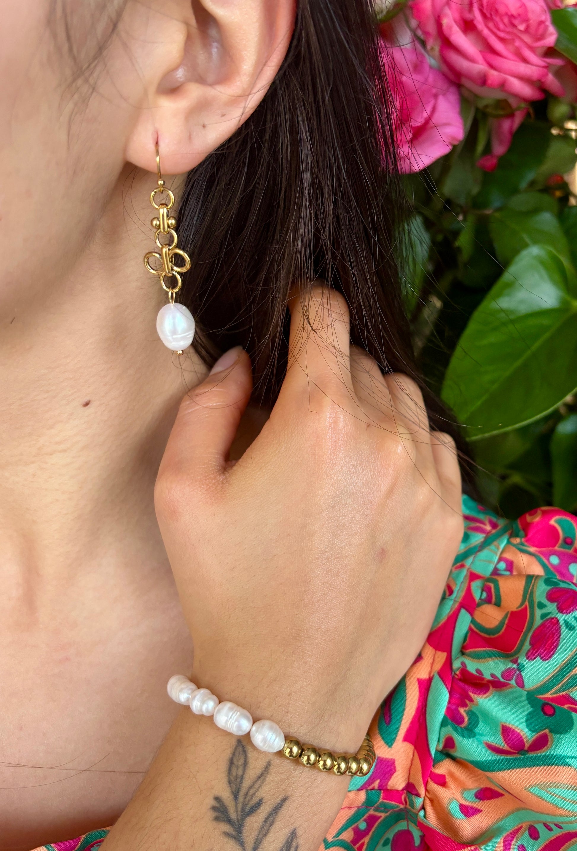 A delicate elastic bracelet featuring half freshwater pearls and half smooth gold tone beads. Easy to wear and perfect for layering or wearing alone.