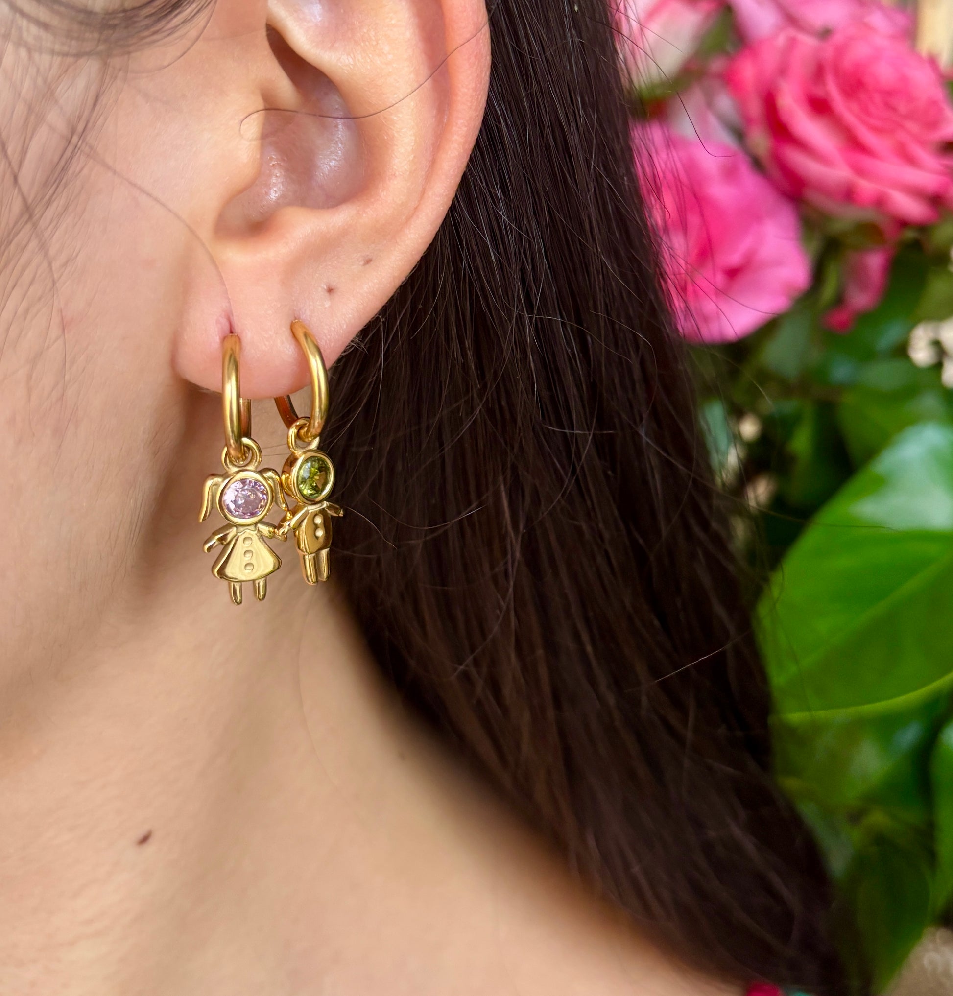 A whimsical nod to childhood memories and sweet connections, these hoops feature tiny boy and girl charms with sparkling crystal “faces” in soft pink and olive green. Finished in polished gold, they blend playful charm with a sophisticated touch. Matching necklace also available.
