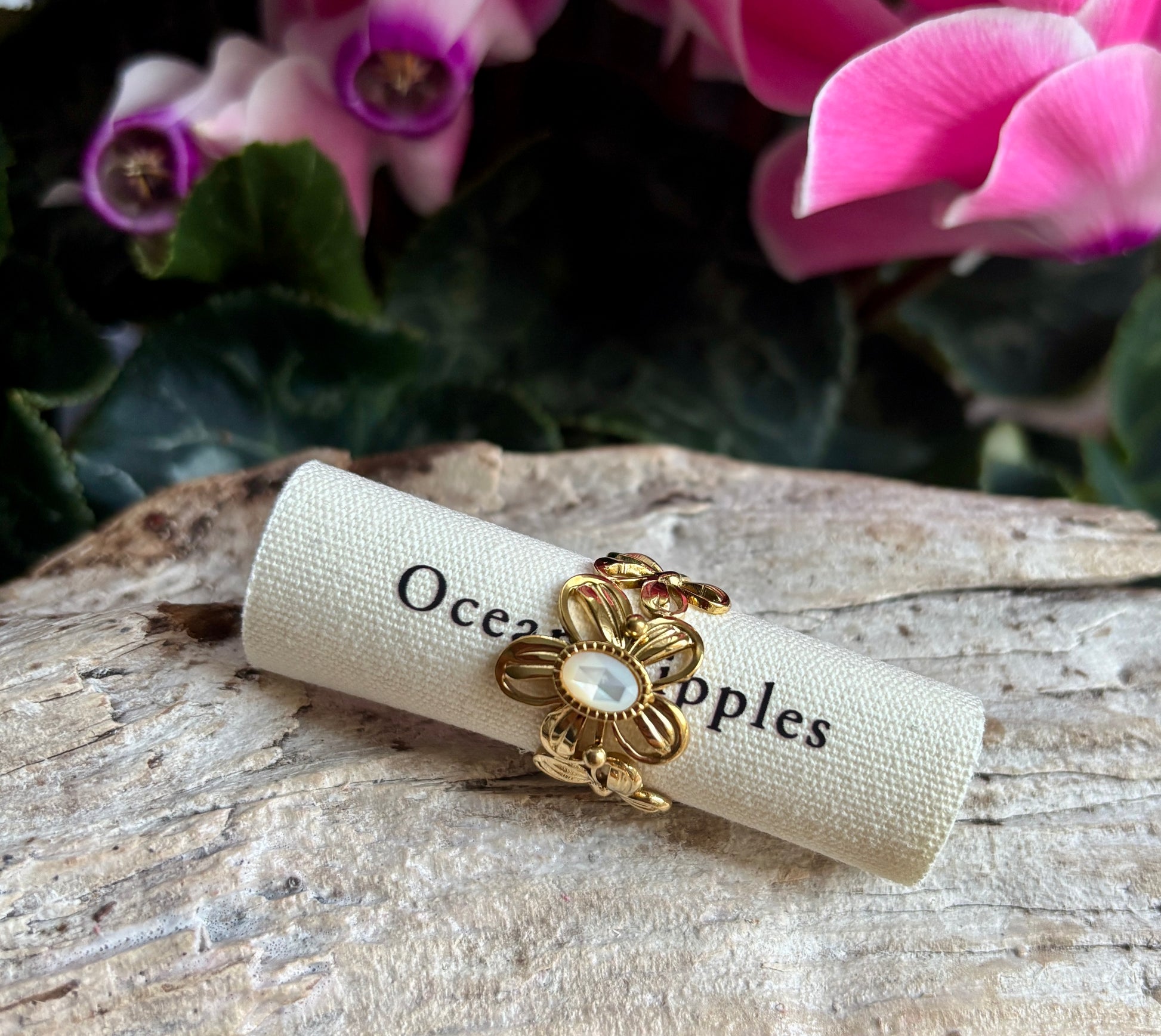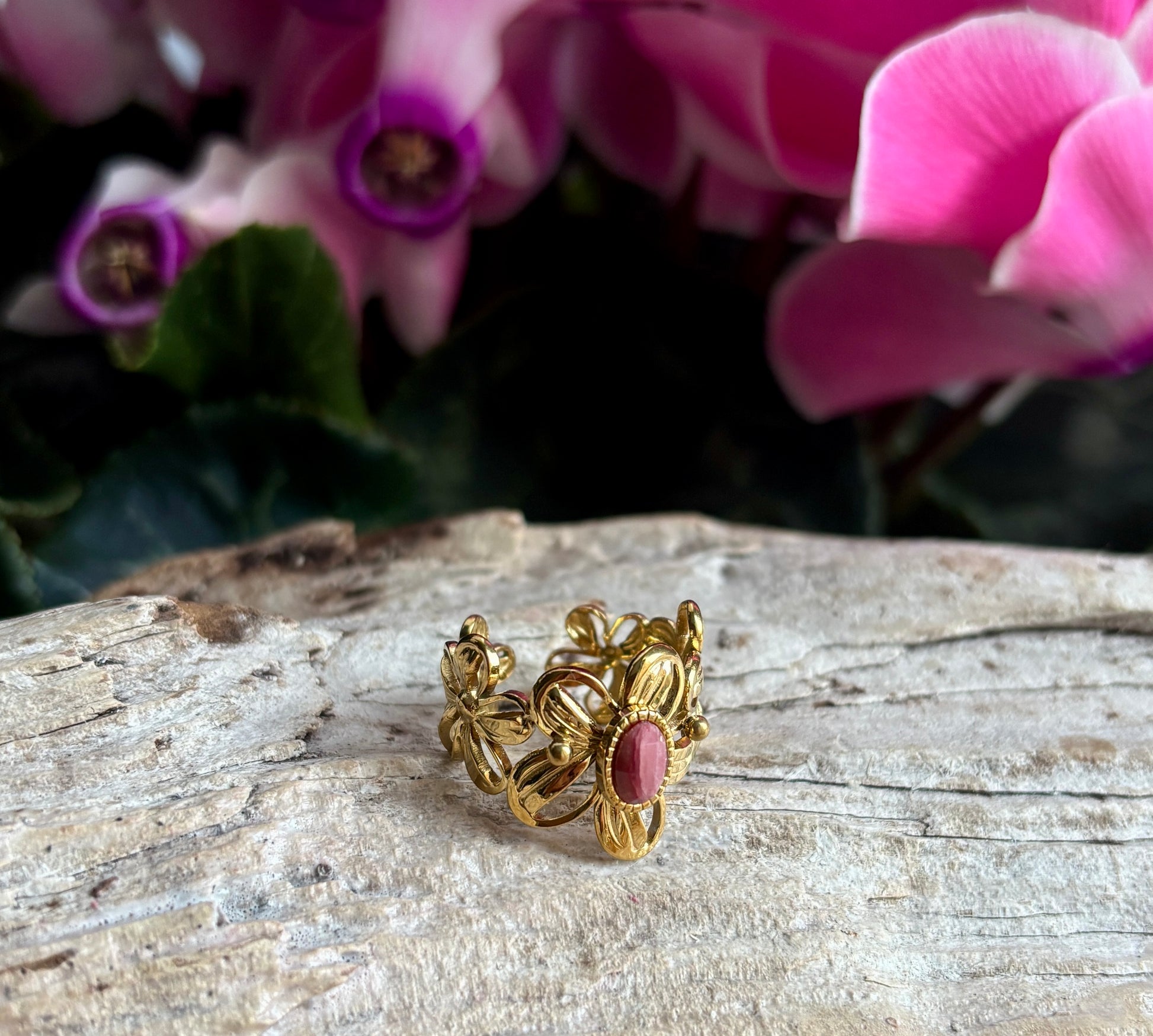 This unique flower band ring showcasing a central natural stone, available in Turquoise, Rhodochrosite, or Mother of Pearl. Its distinctive design adds a bold, artistic touch to any look.