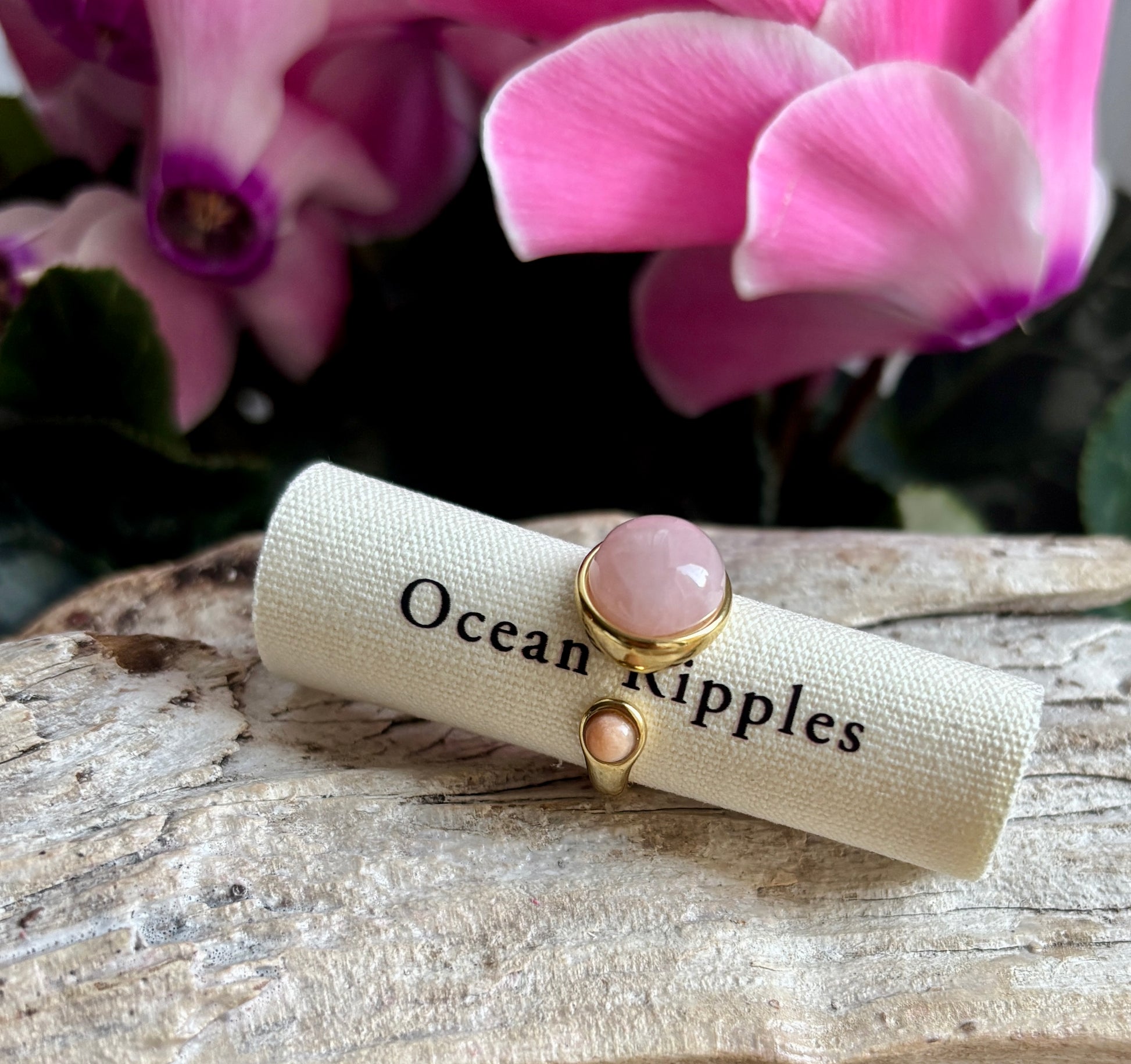 This elegant open top ring featuring two round stones set at each end. Available in Amazonite or Rose Quartz for a modern yet softly feminine finish.