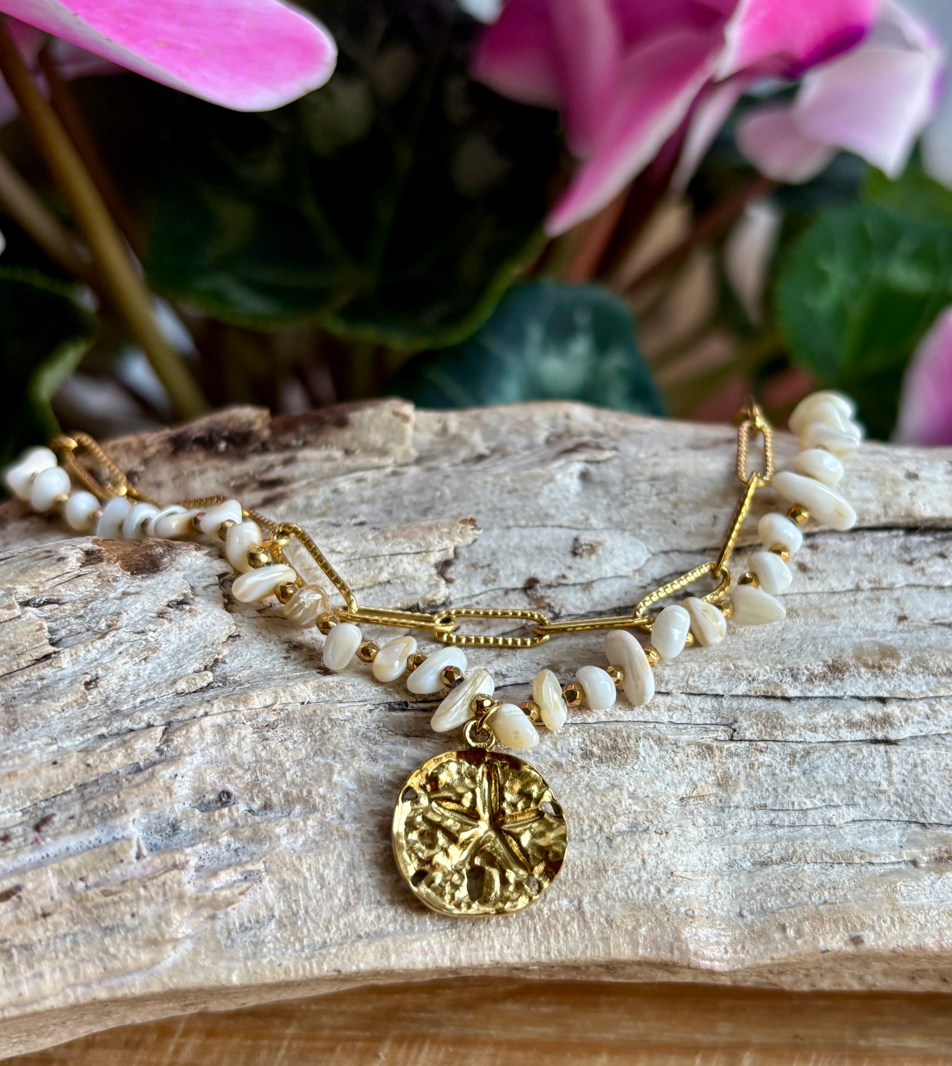 This bracelet pairs two contrasting chains, one featuring soft shell chips and the other a sleek gold paper chain for a layered look. Finished with a hammered gold disc charm, it blends organic texture with modern elegance.
